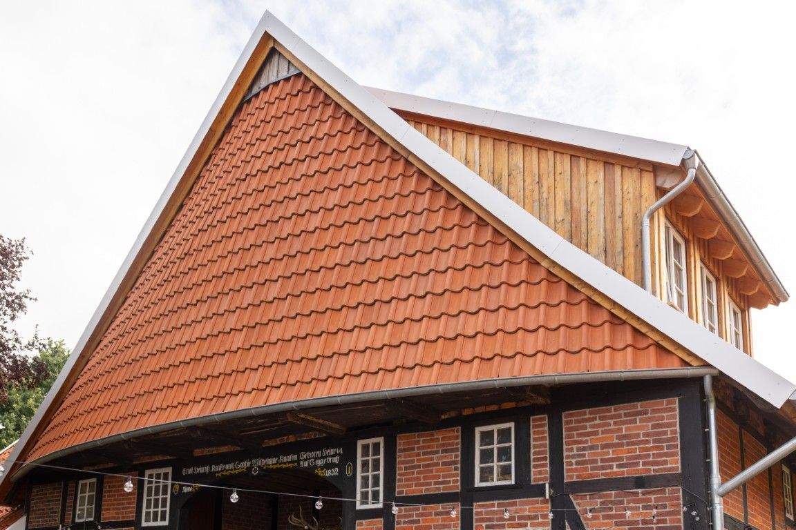 Das große Fachwerkhaus erhielt ein neues, langlebiges Ziegeldach mit mehreren Dachfenstern. Die Sanierung schützt die historische Substanz und sorgt für ein stimmiges Gesamtbild.